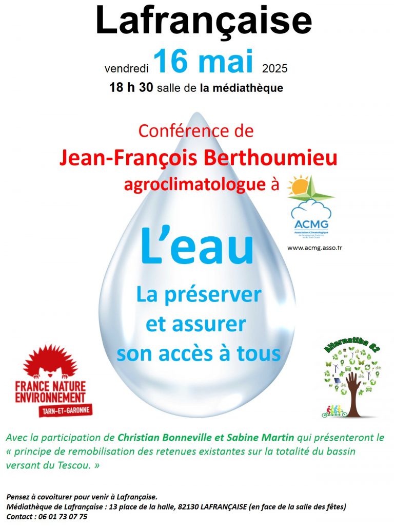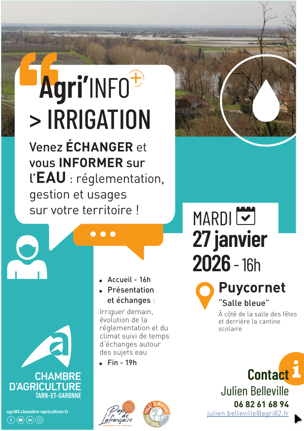 Action d’informations et d’échanges sur la ressource Eau animé par la Chambre d’Agriculture, dans le cadre du PAT Pays de Lafrançaise Mardi 27 janvier 2026 à 16h à Puycornet