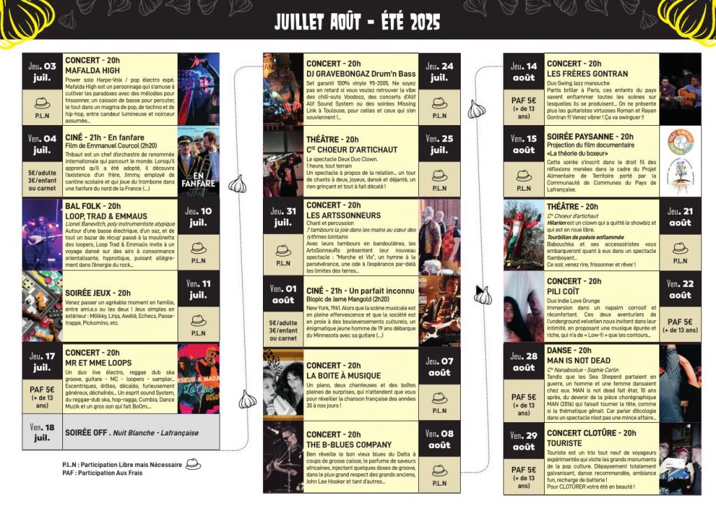 Nous voici de retour pour la 3ème et dernière session estivale de l’Embusc’ail… Une saison que nous espérons haute en couleurs et enrichissante ! Cette année encore, rejoignez-nous les jeudis et vendredis du 3 juillet au vendredi 29 Août, à partir de 18h30 ! Au programme : toujours de la bonne humeur et surtout des concerts, des projections cinéma, un spectacle de clown, du théâtre, une soirée jeu, un bal et de la danse !
