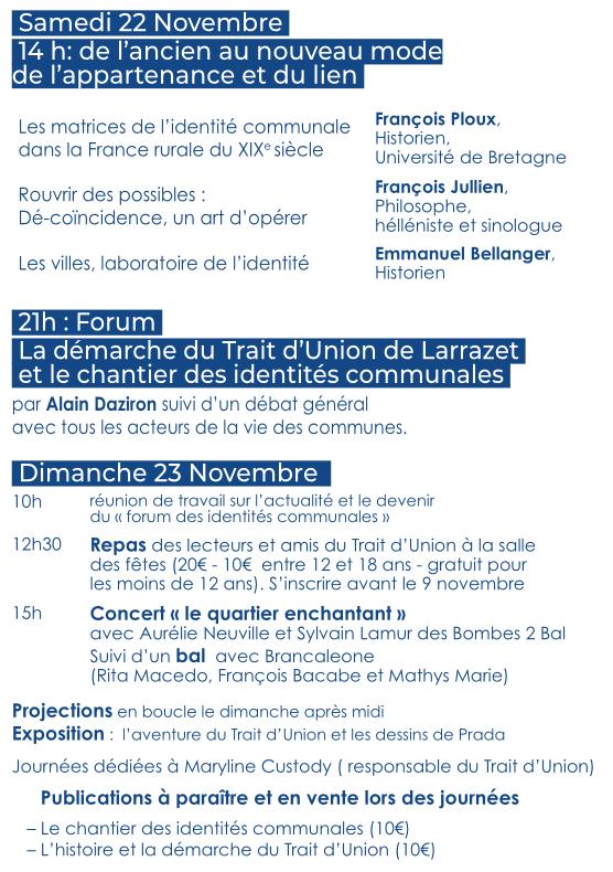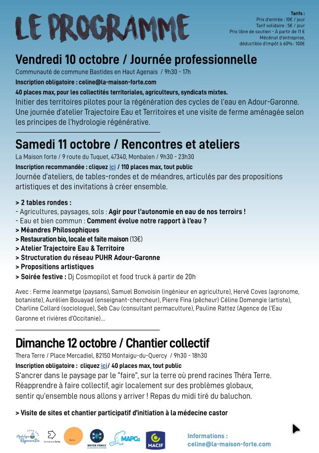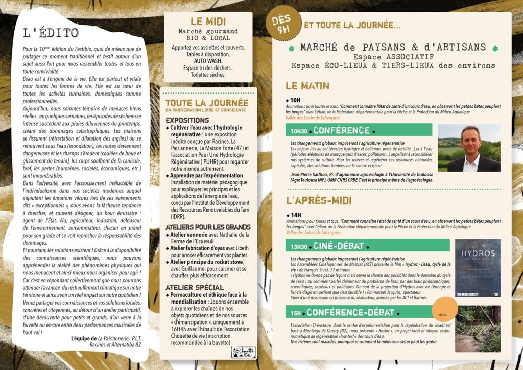 dernière minute : à rajouter au programme : ATELIERS Théâtre enfants adultes à partir de 6 ans de 11h à 11h45 et 15h30 à 16h15 thème : « les gardiens des arbres » : improvisations structurées, jeux de théâtre, d’actions afin de proposer au fil de l’atelier des solutions concrètes pour faire partie des gardiens des arbres. Création d’une petite structure théâtrale avec tout ce qui aura été récolté en fin d’atelier. Proposé par Marielle Costamagna animatrice en théâtre et permaculture. Association Biodiversité Ré Enchantée.